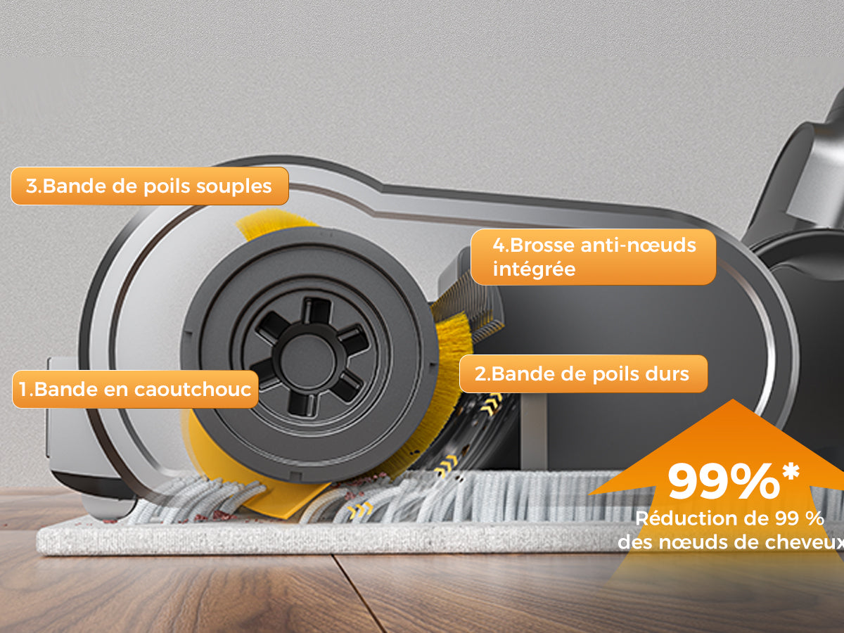 Une brosse multifonction combinant quatre éléments—poils souples, poils durs, bande en caoutchouc et structure en V—réduit les nœuds de poils et améliore le nettoyage sur tous les types de sols.