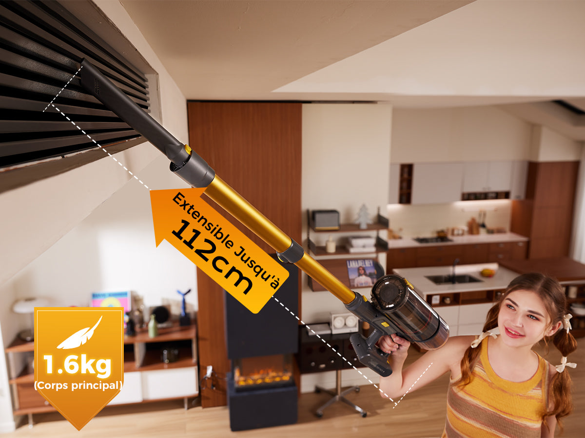 Le tube extensible atteint 112 cm pour nettoyer confortablement à toutes les hauteurs. Avec un poids équivalent à trois bouteilles d’eau de 550 ml, il est léger et facile à manier.