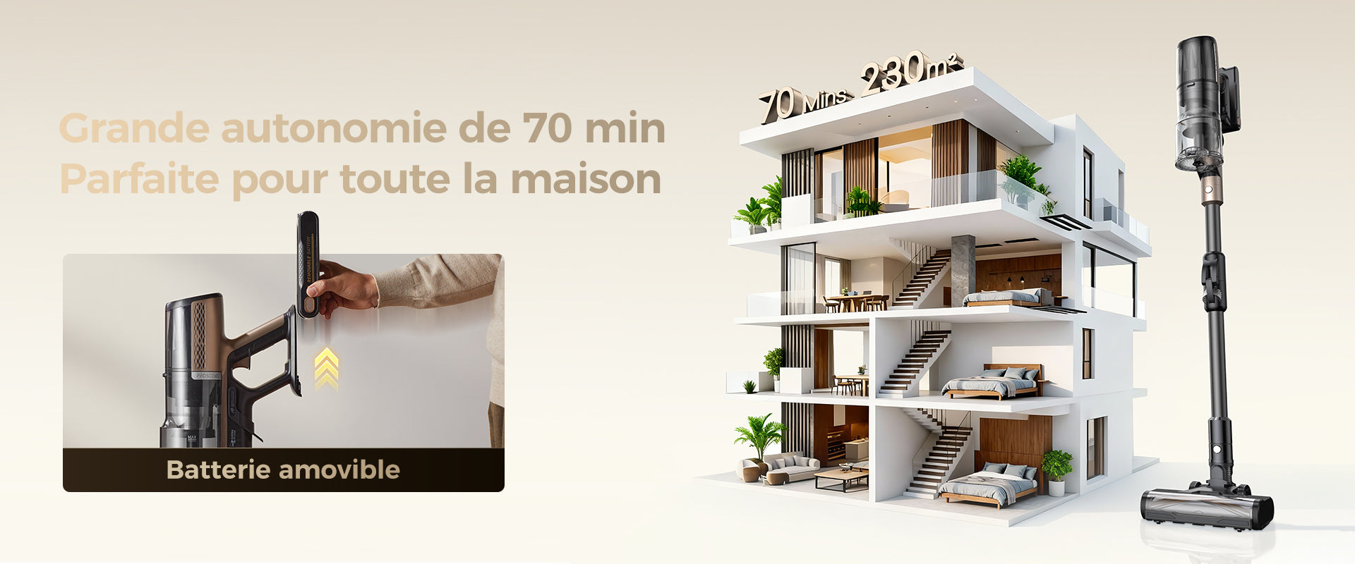 Profitez jusqu’à 70 minutes de nettoyage grâce à la batterie amovible, offrant une charge flexible et des sessions de nettoyage prolongées.