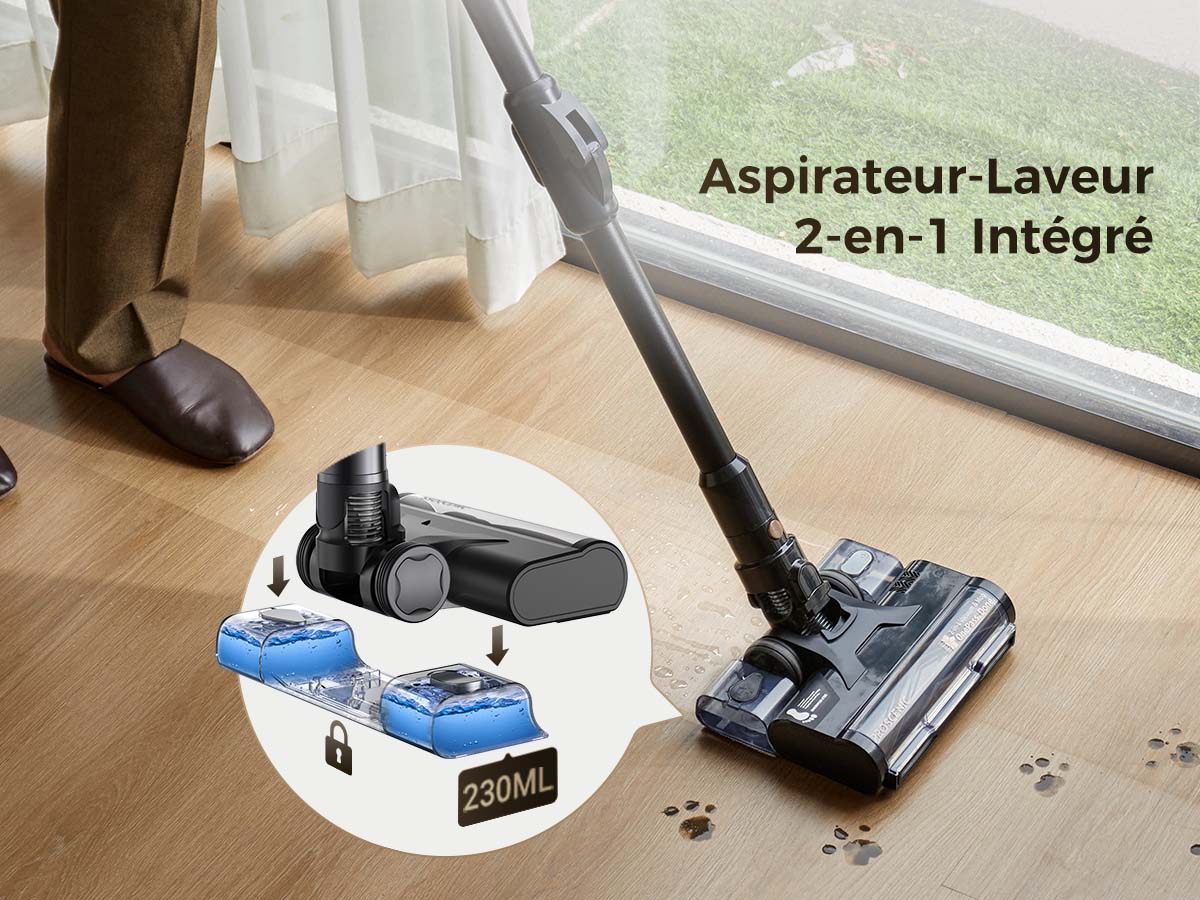 Le réservoir d’eau supplémentaire permet d’aspirer et de laver en une seule étape, pour gagner du temps et obtenir un nettoyage plus complet.