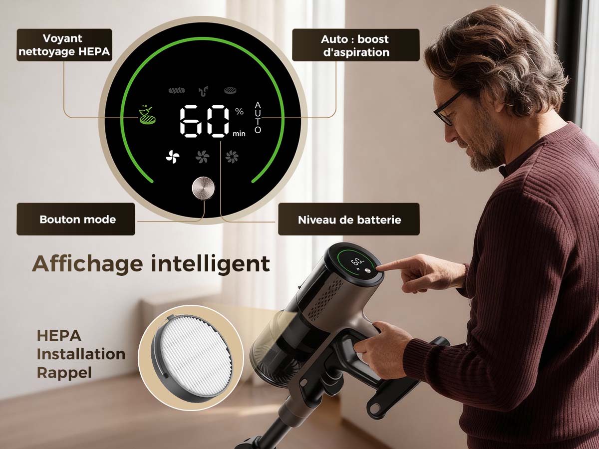 L’écran LED affiche le temps de fonctionnement restant en un coup d’œil, pour mieux planifier le nettoyage et éviter les coupures soudaines.