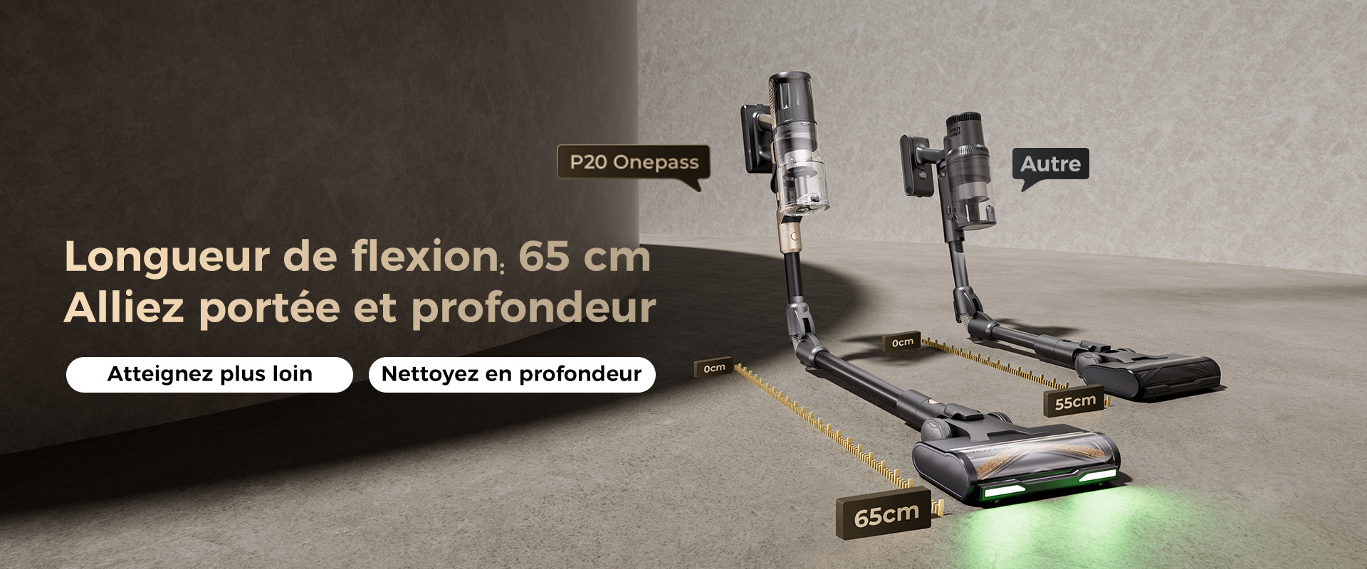 Le tube pliable de 65 cm du P20 OnePass est environ 20 % plus long que les modèles standard, facilitant le nettoyage sous les meubles sans avoir à se pencher.