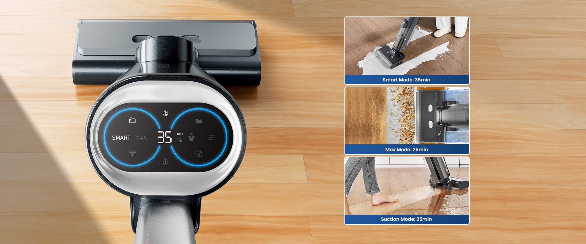 La batterie amovible de 6×2.500 mAh offre jusqu’à 35 minutes d’utilisation sur une seule charge. Les réservoirs séparés de 1 L pour l’eau propre et l’eau usée permettent de nettoyer jusqu’à 120 ㎡ sans interruption. (*Batteries supplémentaires disponibles séparément pour prolonger l’autonomie.)